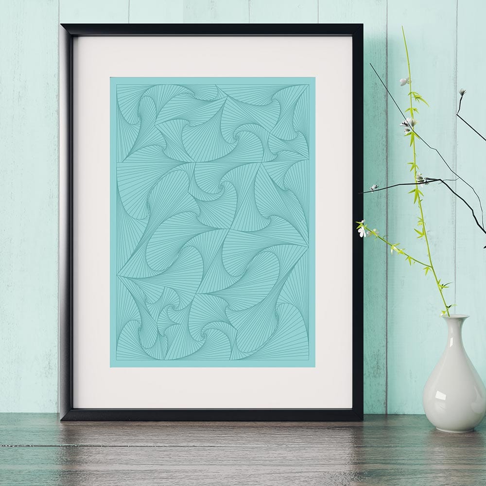 The Mind Bender giclee print in teal instantly captivates anyone who sees it. This extraordinary piece of wall art draws the eye with its hypnotic and zen-inspired design. Moreover, its calming yet visually striking patterns invite viewers to enter a state of peaceful reflection. The intricate waves and delicate details actively engage the imagination, transporting the mind toward tranquillity.